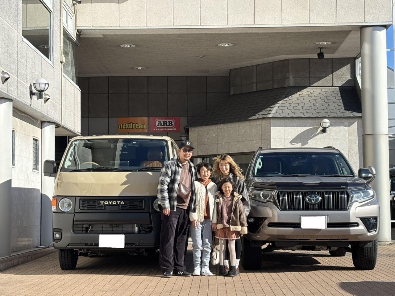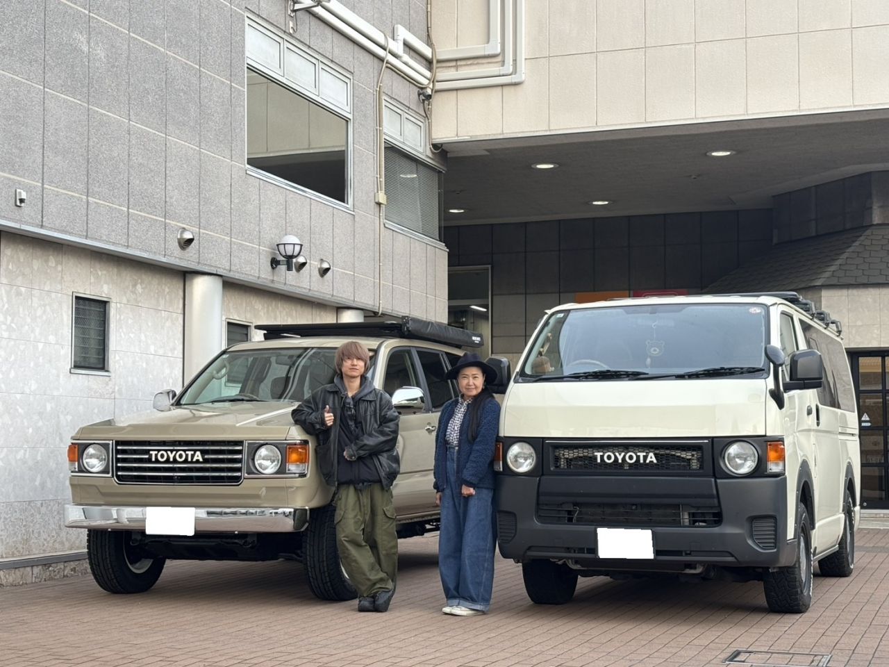 お母さま(右)は以前当店で丸目ハイエースを相棒に選んでいただき、今回は息子さん(左)が120プラドのオーナーに!